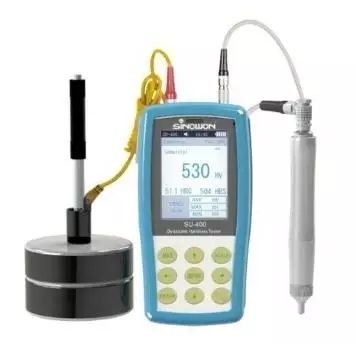 SU-400里超硬度計(jì)是一款結(jié)合動態(tài)反彈里氏測量方法和靜態(tài)超聲波維式測量方法的二和一便攜式硬度計(jì),SU-400不僅可以支持超聲波手動1Kg,2 Kg,5 Kg,10 Kg探頭和電動0.3 Kg,和1Kg探頭進(jìn)行超聲波接觸阻抗法測量,而且還支持里氏測量的7種動態(tài)沖擊裝置,即D,DC,DL,D+15,C,E,G進(jìn)行動態(tài)里氏反彈測量??梢杂贸暤姆椒y量比較薄、粗糙度比較好的試樣,也可以用里氏方法測量比較粗糙的試樣。在一臺機(jī)器上,不僅用超聲的方法彌補(bǔ)了里氏硬度計(jì)無法測量電鍍層和硬度層試樣的難題,還用里氏的方法彌補(bǔ)了超聲波不好測量粗晶材料硬度的問題。